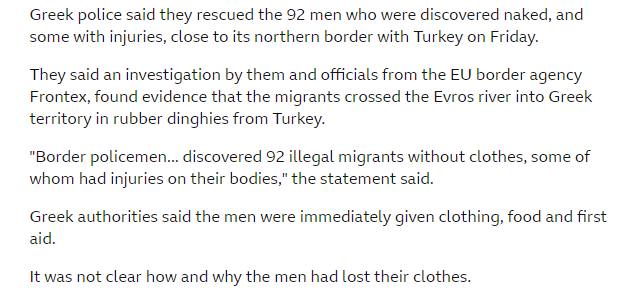 相關段落,大致意思是説,歐洲邊境機構Frontex的工作人員稱,有證據表明這些偷渡人員乘坐橡皮艇,從土耳其穿過埃夫羅斯河進入希臘領土,但目前還不清楚為什麼這些人沒有穿衣服。
