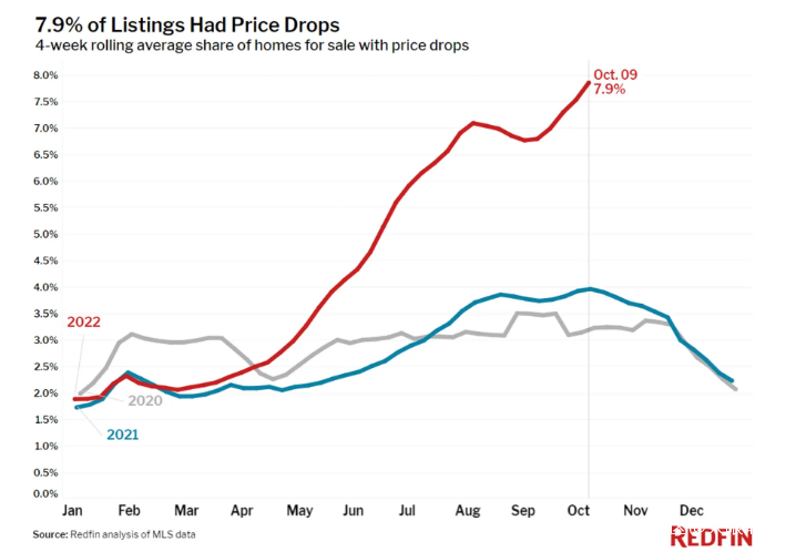 根據Redfin 編制的報告稱,在截至 10 月 9 日的四個星期內,約有 7.9% 的房屋掛牌價格下跌。與去年同期相比,這一數字創下了歷史新高,並出現顯著上升的趨勢,而在去年同期只有 4% 的上市房源降價出售。