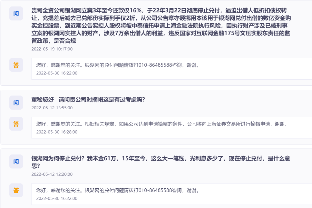 目前,P2P暴雷餘波未散。在2022年5月還有投資在在互動問答平台上尋問“銀湖網”何時還款兑付。