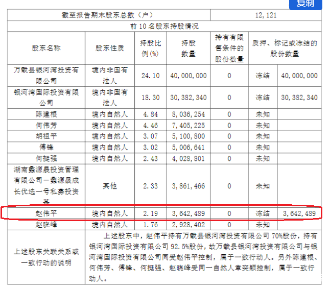 公司2022年 半年度報告顯示,趙偉平持有熊貓金控2.19%的股份,為公司第九大股東。 同時其還持有萬載縣銀河灣投資有限公司70%股份,持有銀河灣國際投資有限公司92.5%股份,故萬載縣銀河灣投資有限公司與銀河灣國際投資有限公司同受趙偉平控制,屬於一致行動人。