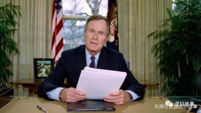 老布什激動地説,世界曾被分成兩個對抗的軍事陣營,現在剩下唯一一個卓越無比的強國,那就是美利堅共和國。