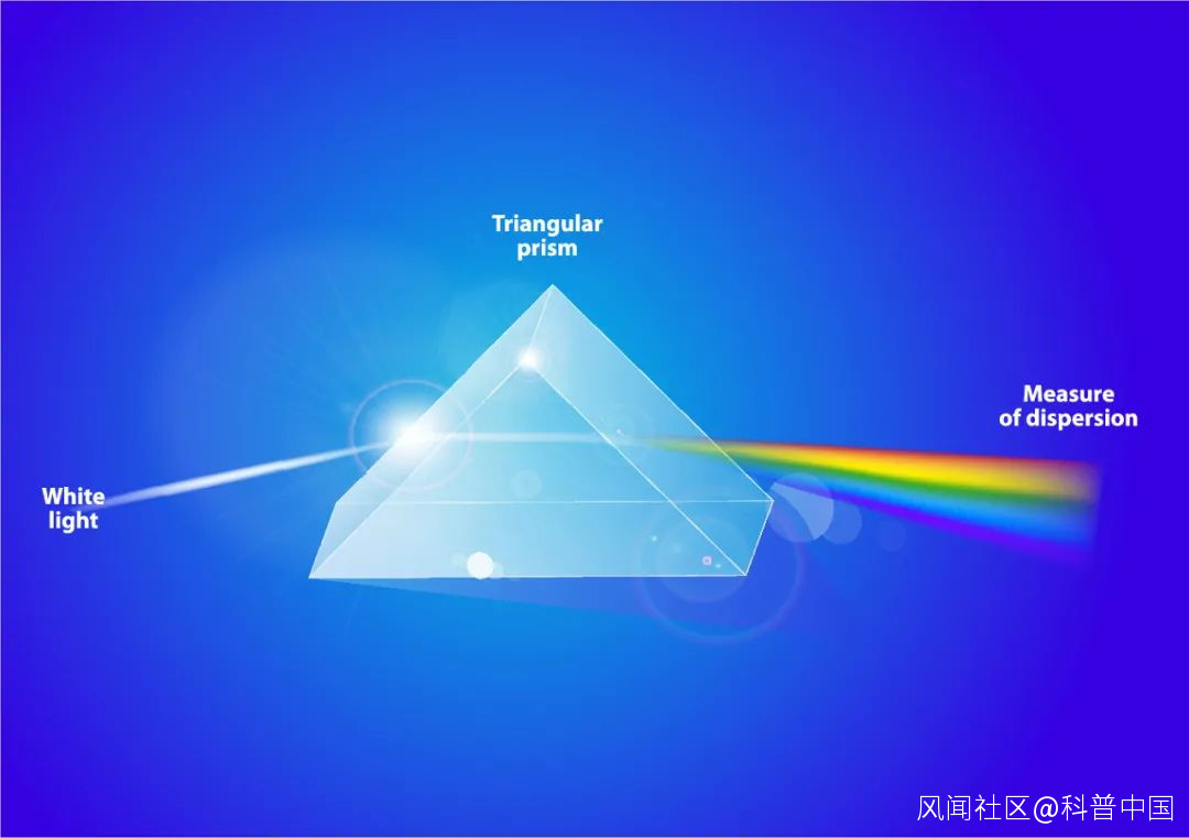 白光經過三稜鏡,會被分拆成一條彩色的光譜,不同波長的光次第排列,波長從長到短依次是紅、橙、黃、綠、青、藍、紫,當然不是簡單的七種顏色,而是這些顏色之間存在着平滑的過渡,我們能看見的顏色遠不止七種。
