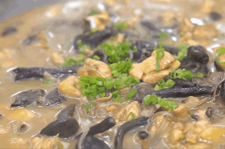 鮮嫩的小雞肉,配着緩慢舒展的蘑菇幹,在粉條的加持下中小火慢燉,各種風味相互交融。酥爛脱骨的雞,醇香味美的菇,彈軟適宜的粉,共同奏響了東北“第一燉”的交響曲。