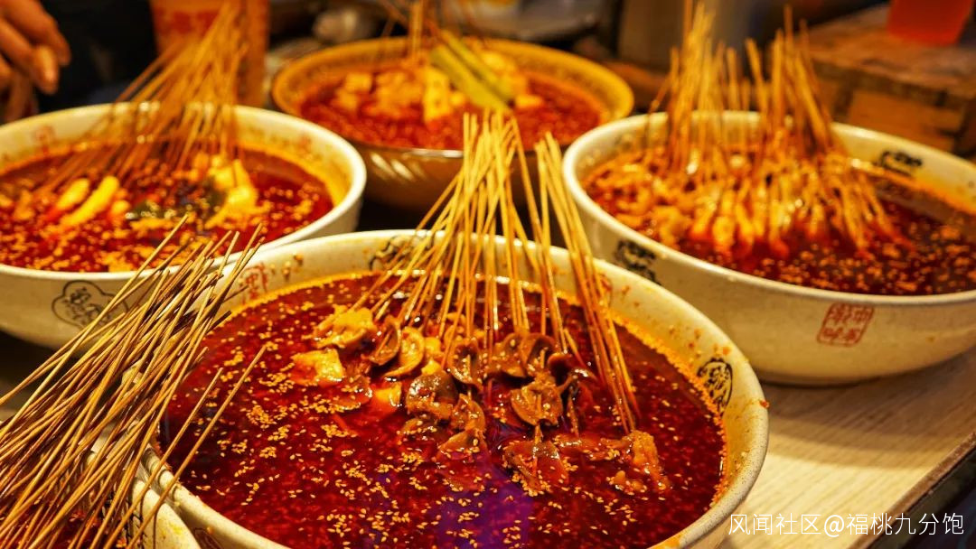 肉片是肉片,臟腑是臟腑,雞腿是雞腿,翅膀是翅膀,煮熟但不煮爛的雞晾乾切片,用竹籤分門別類串成串,供人挑選。再來點兒海帶、腐竹,陪着缽缽雞放到藤椒油湯裏一撈,提起來油豔欲滴,辣香四溢。