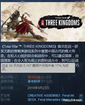然而,原本對遊戲抱有高度熱情的中國玩家們卻不買賬,停止更新的消息一出,國內玩家紛紛表達不滿和失望之情,作為對CA從《全面戰爭:三國》中跑路的抗議,玩家們衝進遊戲的Steam商城頁面刷起了差評,在一週內就將遊戲的短期好評率刷到了“差評如潮”,超過5000條評測中的好評僅有17%。