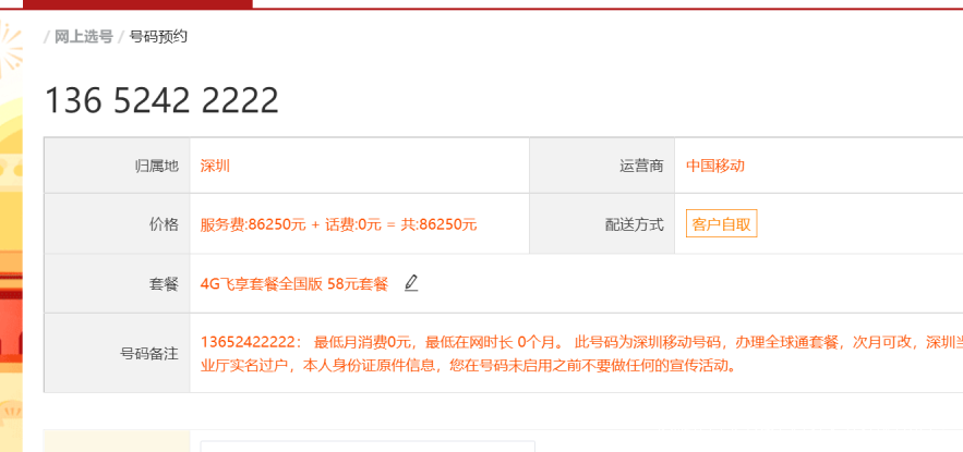 網站拍品描述稱,該手機號為“中國6最多、最順利號碼”。拍賣信息特別顯示,該手機號中的剩餘話費餘額38萬餘元不包含在本次拍賣成交價中。