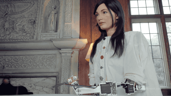 她名叫Ai-Da,自稱是世界上第一位超寫實機器人藝術家,並介紹了自己的雙眼是攝像頭,用機械臂執筆,靠AI算法畫畫。