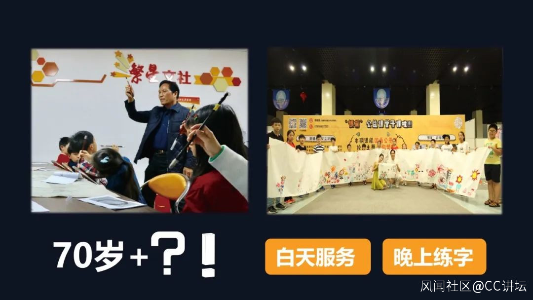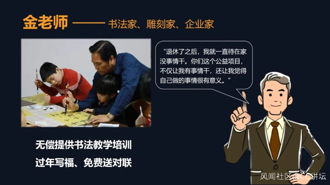 我們通過幫老人出門找朋友,加送朋友上門兩種方式治療孤獨,探索老年人的後黃金20年。首先我先去給老人們找點事幹幹,這是我們擅長書法和雕刻的金老師。2018年的時候,他就加入到了我們的銀齡學堂,直到現在我還清楚的記得,金老師第一次跟我見面時講的話,他説:“我年輕的時候為了賺錢養家,放棄了自己的愛好,每天早出晚歸,雖然賺到錢 其實真的不開心。退休之後反而開心了,你看我現在每天給你們上上課,或者給外來務工小朋友們教教書法,雖然沒有什麼收入,但是總比我一直待在家裏好吧?而且我也在做我喜歡做的事情。”