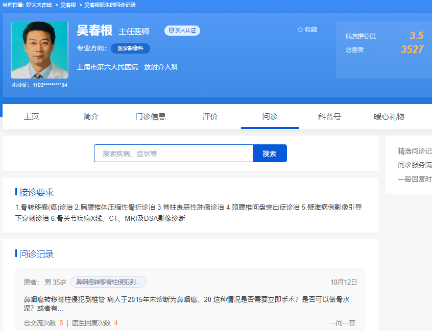 醫、學、研三管齊下,忙得幾乎沒有個人時間的吳春根無力運營網站,只能將自己的個人網站關停。就在那時,好大夫在線平台向他發來邀約,邀請吳春根入駐平台,在線看診。沒有過多猶豫,吳春根就同意了,在平台開設賬號,直至今天,“這些平台有專人運營,不用自己費精力,很方便”。