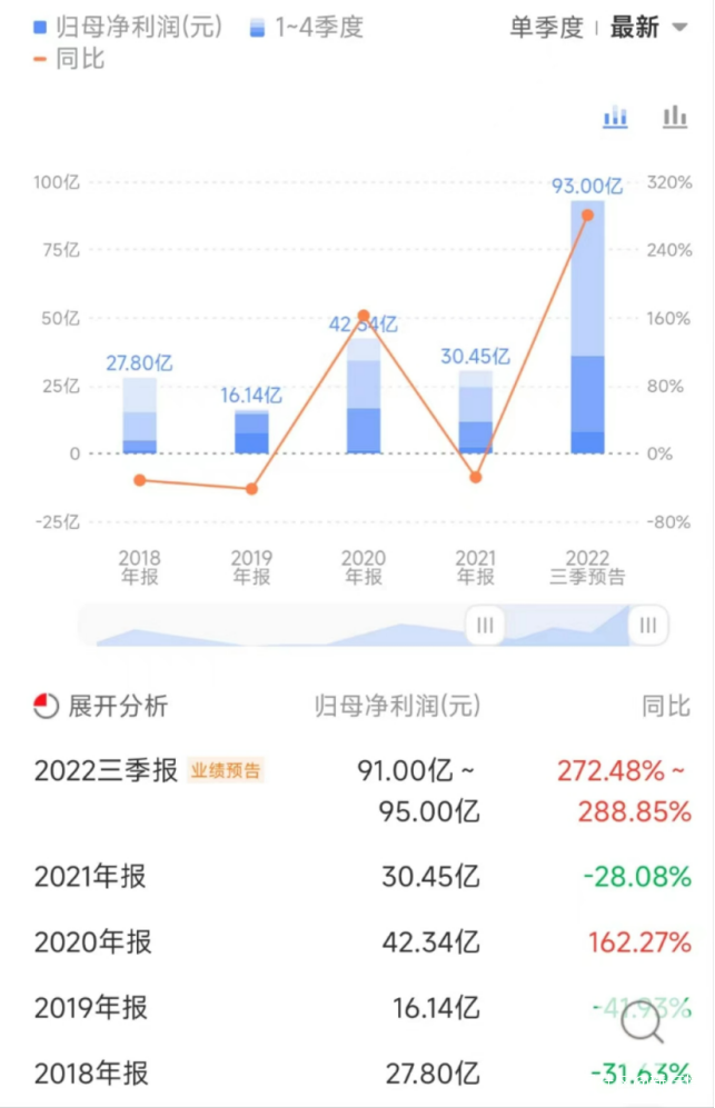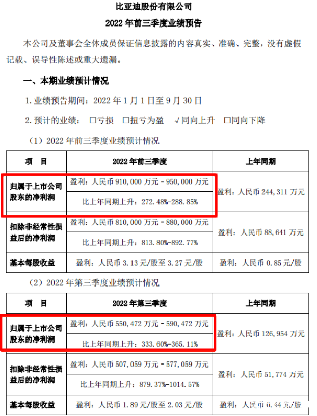 比亞迪預計,前三季度歸母淨利潤預計為91億元至95億元,同比增長272.48%至288.85%;扣非歸母淨利潤預計為81億元至88億元,同比大增813.8%至892.77%。