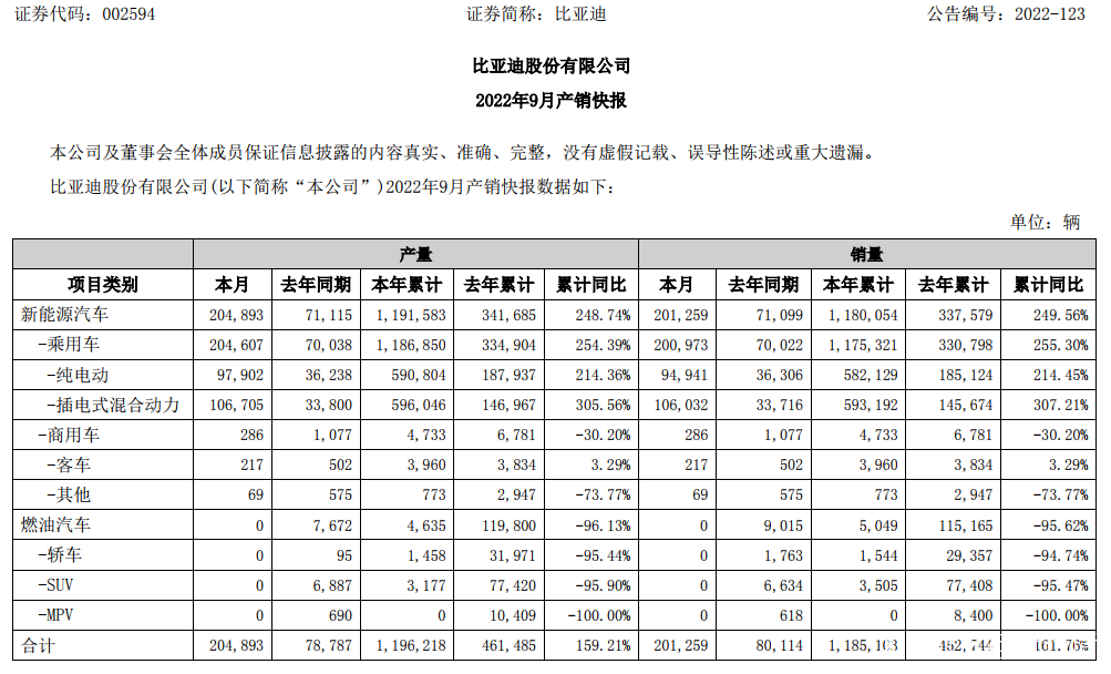 不久前,比亞迪公佈了2022年9月份產銷快報,數據顯示,比亞迪9月份銷量達到了20.13萬輛,同比增長151.22%;整個第三季度,比亞迪新能源車總銷量54萬輛,比特斯拉多了近20萬輛;今年1-9月累計銷量達118.51萬輛,累計同比增幅達161.76%。