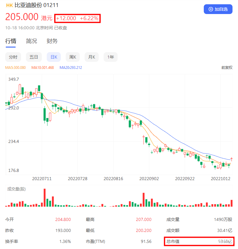 10月18日早盤,比亞迪競價高開7.04%,報279元。截至收盤股價報273.67元/股,漲4.99%,總市值7967億元;港股報收205.00港元/股,漲6.22%,總市值5968億港元。
