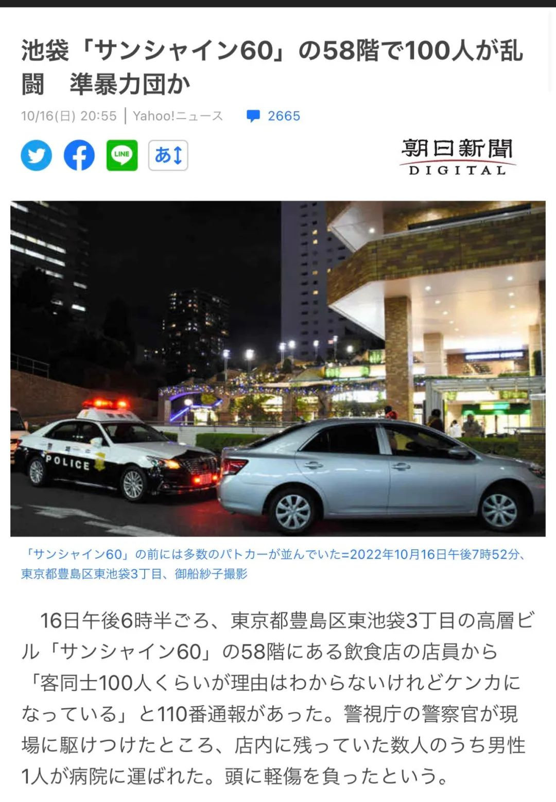 新聞説的是,在東京池袋的某飯店內,發生了100人規模的大亂鬥,飯店服務員打電話報的警。