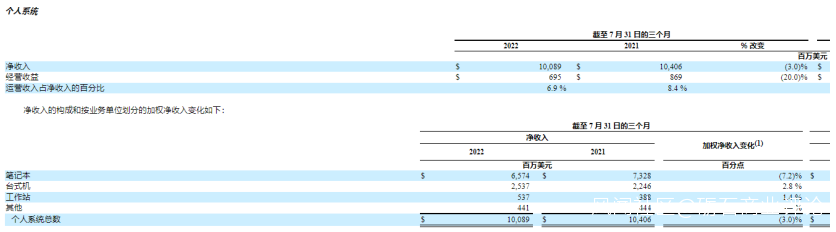 第三財季,惠普個人系統部分實現營收101億美元,同比下滑3%;其中,消費者業務淨收入下降20%,商業淨收入增長7%;出貨量方面,惠普總出貨量下降25%,其中筆記本出貨量下降32%,台式機出貨量微幅上升1%。