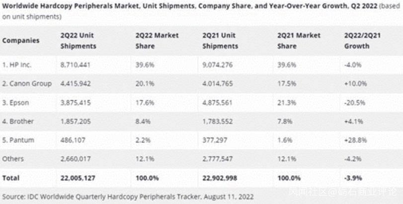 根據IDC數據,2022年第二季度全球打印機市場出貨量為2200萬台,同比下降3.9%。前五大品牌中,佳能、兄弟和奔圖營收實現同比正增長,惠普和愛普生則出現同比下滑。