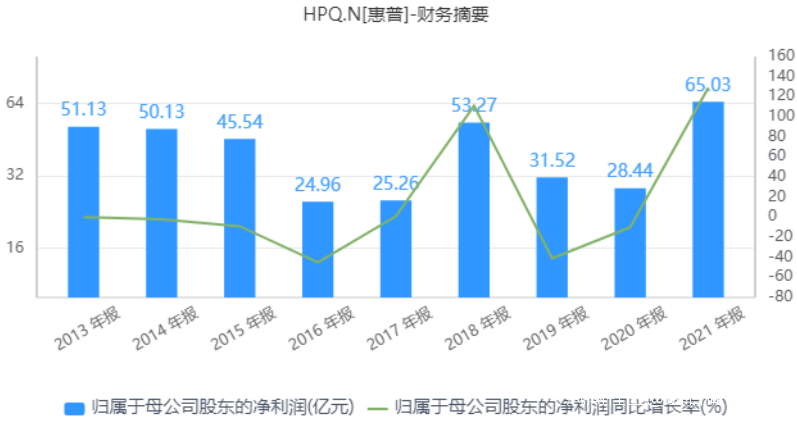 相比惠普企業,近幾年惠普公司發展相對較好。數據顯示,2016年-2021年,惠普公司總營收從482.38億美元增長至634.87億美元,淨利潤則從24.96億美元增長至65.03億美元。其中,2021年度,惠普公司淨利潤已經創下近十年來新高。