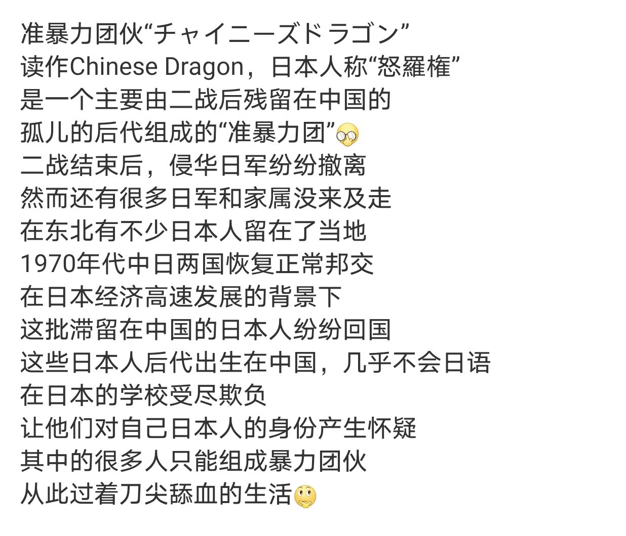 這裏再放上該事件的一個簡單的概括,大致就是一個由二戰後殘留在中國的日本遺孤組成的暴力團伙(日本用來形容黑社會團體的名稱),為了慶祝同伴出獄到餐廳吃飯,結果不知道什麼原因就打起來了。
