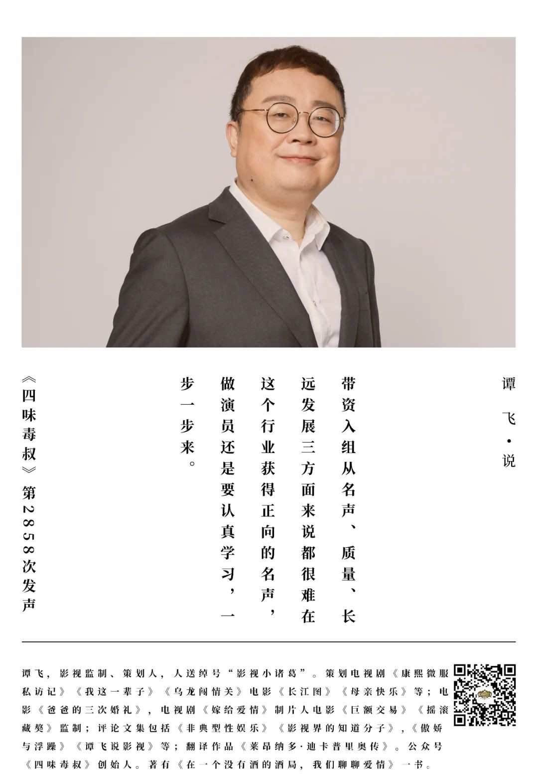 我勸你如果真想拍戲,自己好好去學習表演,從一個小角色演起,別一開始就是女一號兼出品人兼總製片人,我覺得給觀眾的感受太不好了,觀眾也很難會喜歡這樣的戲和你這樣的演員。所以最後還是一句話,希望帶資入組的這種現象越少越好,甚至絕跡。好,今天就説到這裏。