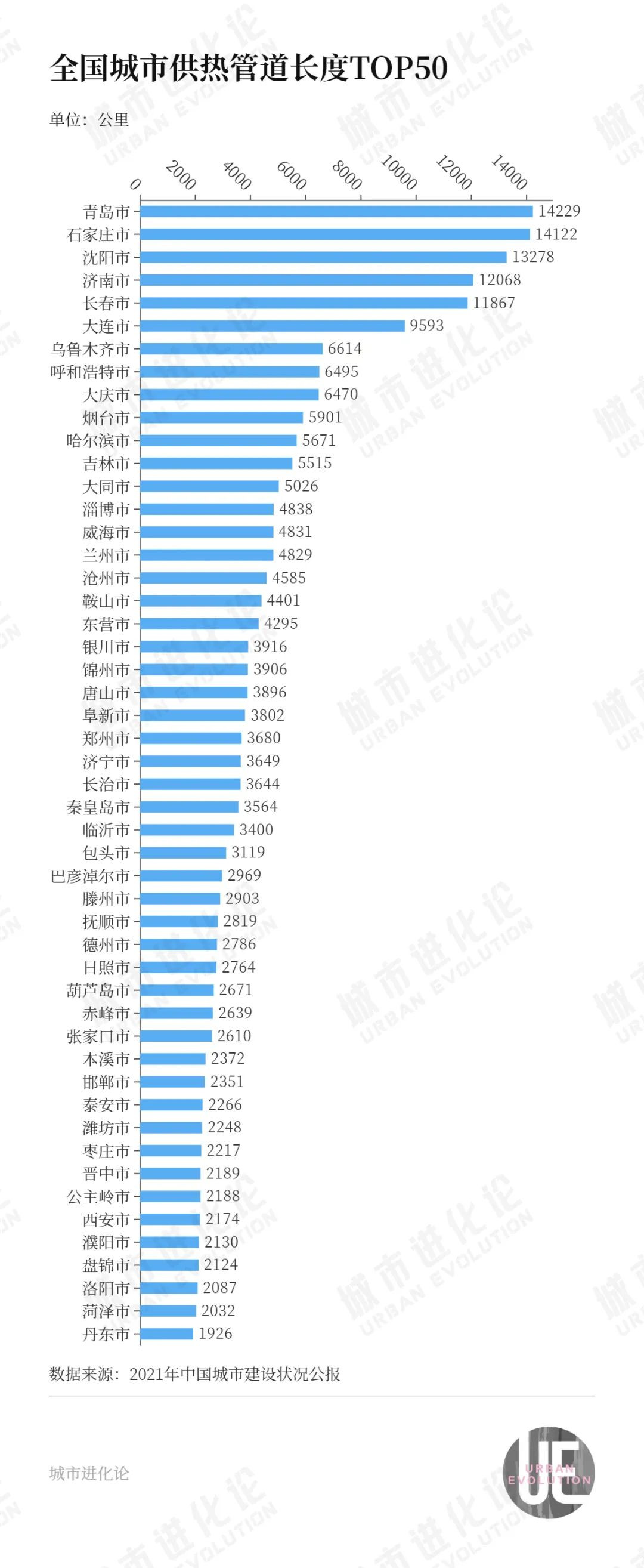 從管道長度來看,青島、石家莊、瀋陽、濟南、長春均突破1萬公里,領跑北方城市。除此之外,大連、烏魯木齊、呼和浩特、大慶等城市管道里程也超過6000公里,較為亮眼。作為北方城市重要的民生工程,供暖設施是否完善也在一定程度上衡量着城市的基建水平。