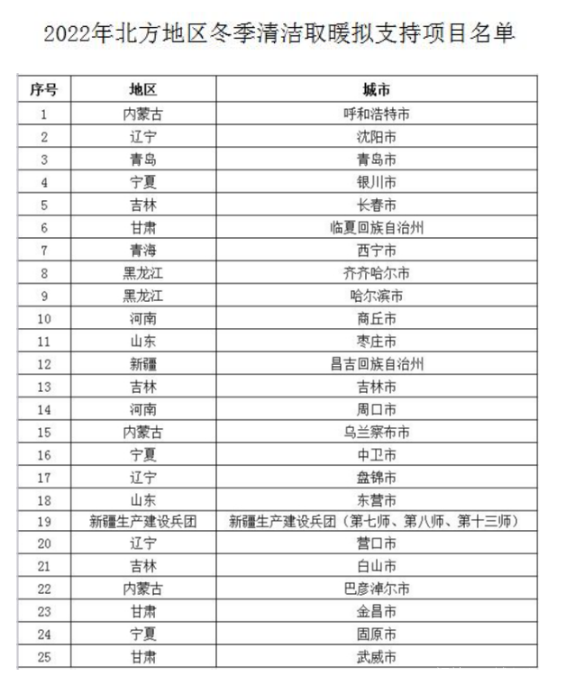 自2017年天津等第一批12個試點城市入選,至今年4月25個項目被納入“2022年北方地區冬季清潔取暖擬支持項目名單”,北方地區冬季清潔取暖試點工作分五批在88個城市先後展開。