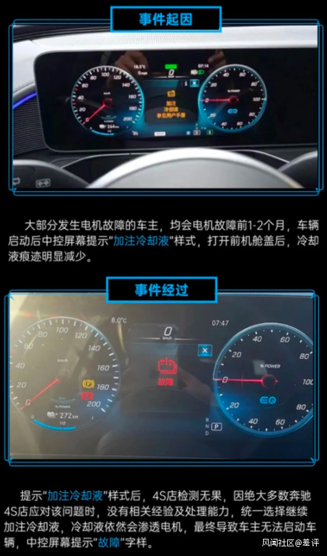 在車主們主動維權後,奔馳發佈了召回計劃,官方的説法是由於電動驅動模塊製造偏差,導致冷卻液滲透。