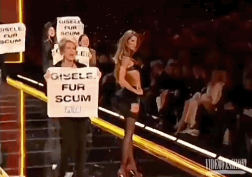 這年的維密上,有一個極端動物保護組織的人因此在她走秀的時候拿着大字報衝上T台,對她進行圍堵。