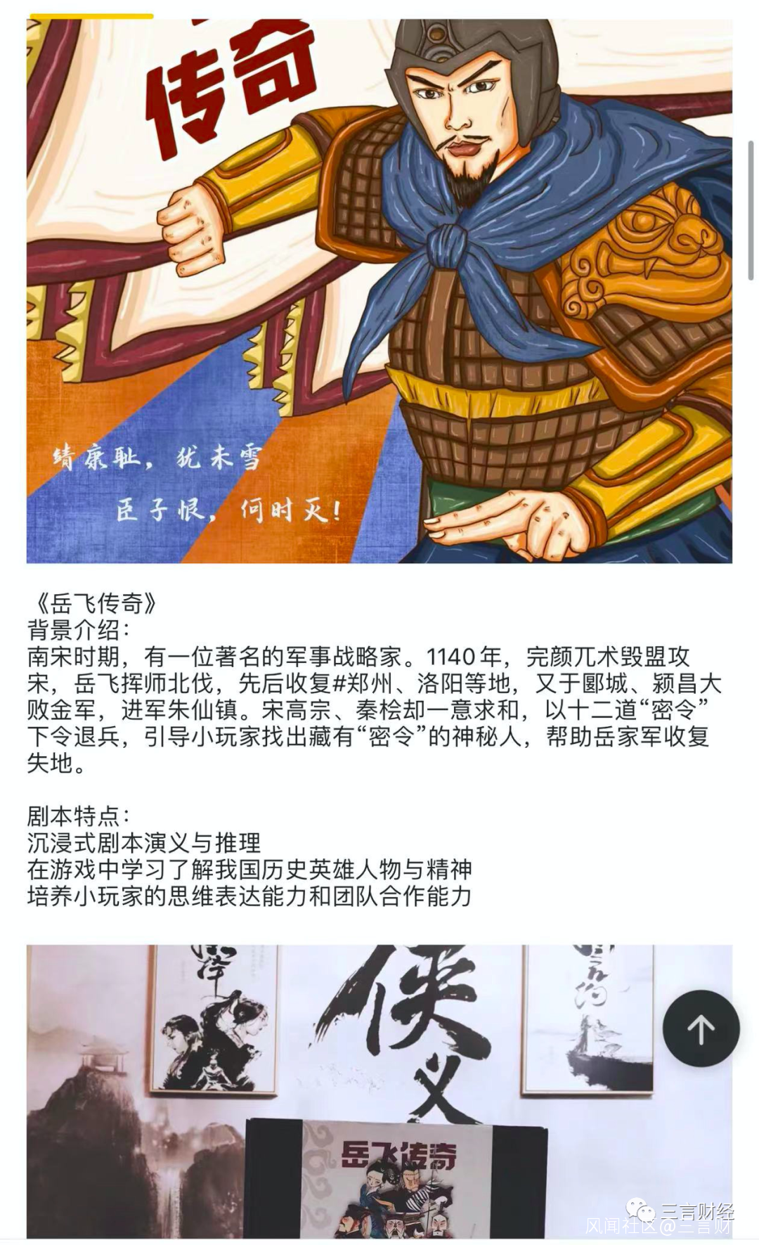 據介紹,該劇本以岳飛抗金的故事為背景,宋高宗、秦檜以十二道“密令”下令退兵,小朋友需找出藏有“密令”的神秘人,幫助岳家軍收復失地。