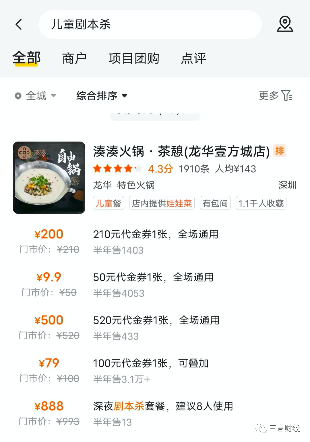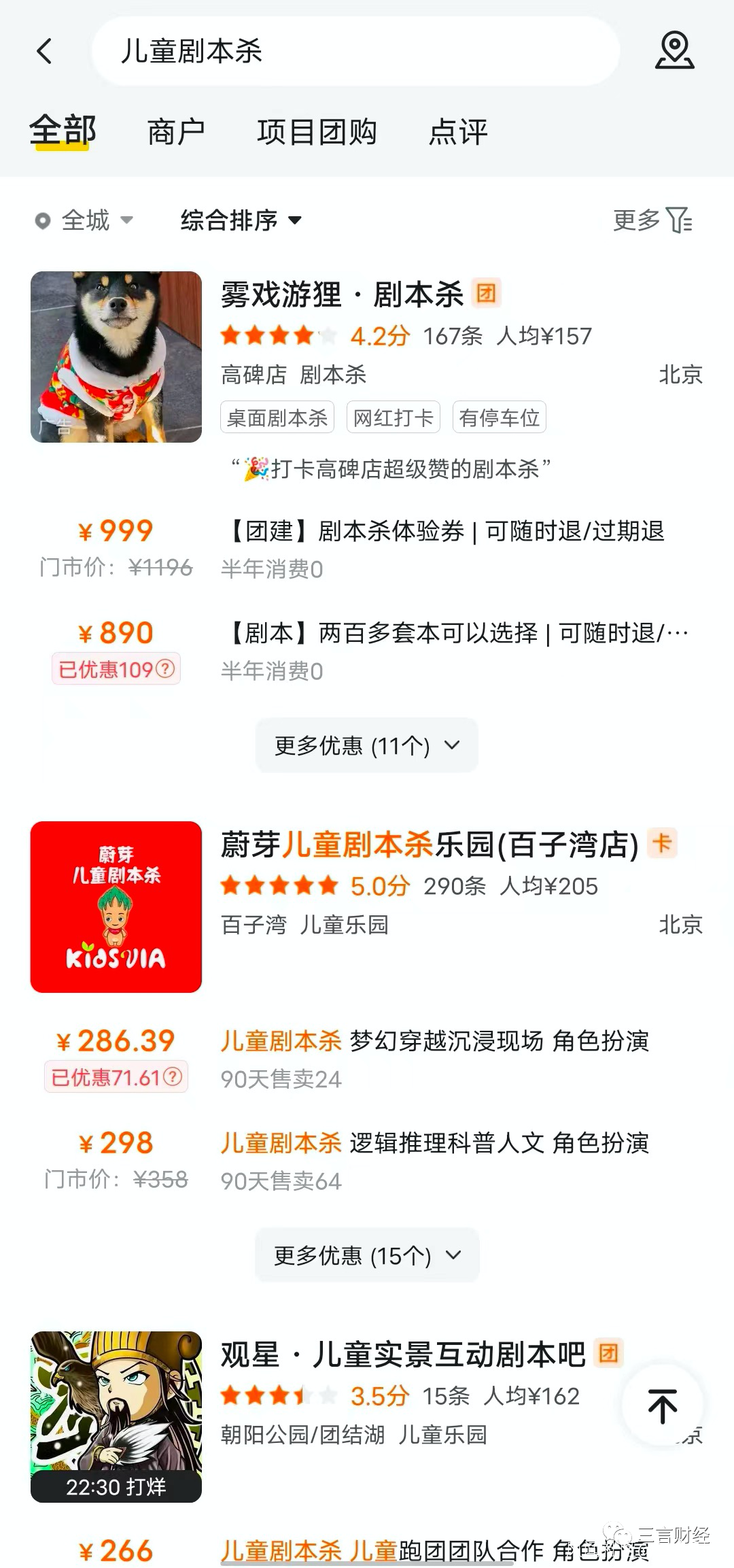 雖然筆者以“兒童劇本殺”為關鍵字進行搜索,但有很多顯示出來的是成人的劇本殺,甚至有火鍋店因為有一個深夜劇本殺套餐而赫然在列。