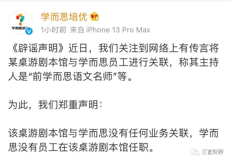 當晚,學而思培優官微發佈聲明稱,該桌遊劇本館與學而思沒有任何業務關聯,學而思沒有員工在該桌遊劇本館任職。