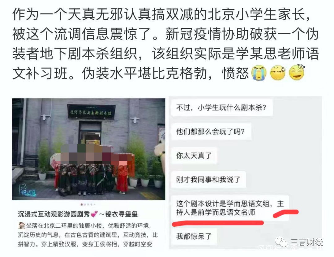 隨後有一張截圖在社交媒體上傳開,截圖稱這家悦某馬劇本殺館實際上是一學而思語文老師補習班,偽裝成桌遊劇本館補課。