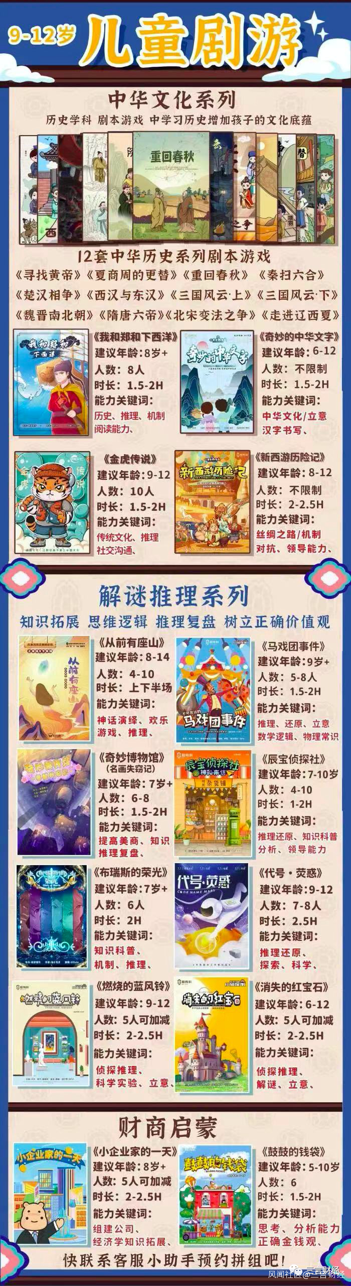 針對9-12歲的兒童推出的劇遊則有《尋找皇帝》、《夏商周的更替》、《重回春秋》、《秦掃六合》等中華文化系列,以及《馬戲團事件》、《奇妙博物館》等解謎推理系列。