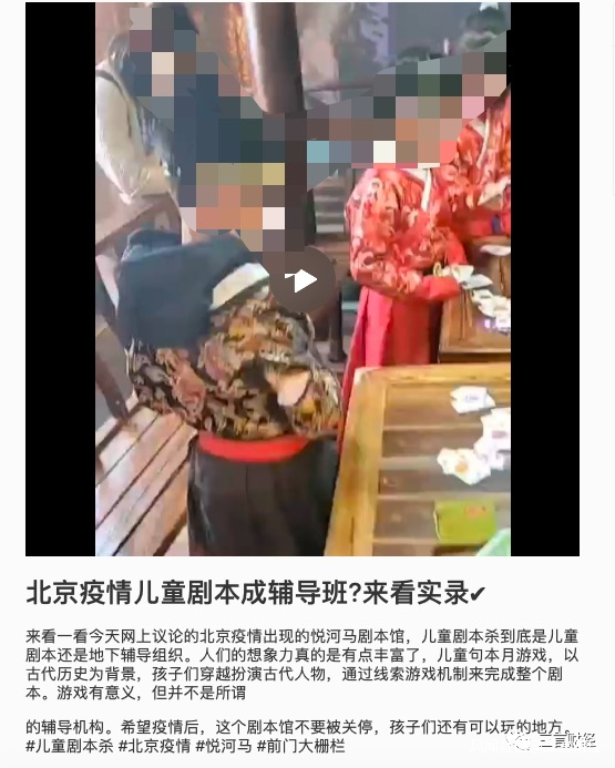 有網友曾發佈悦某馬兒童劇本殺的實景。該網友稱,兒童劇本殺是遊戲,以古代歷史為背景,孩子們穿越扮演古代人物,通過線索遊戲機制來完成整個劇本。遊戲有意義,但並不是所謂的輔導機構。