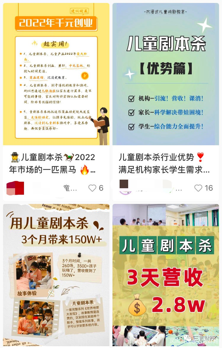 比如,“2022年千元創業”、“用兒童劇本殺3個月帶來150W+”、“兒童劇本殺三天營收2.8W”。
