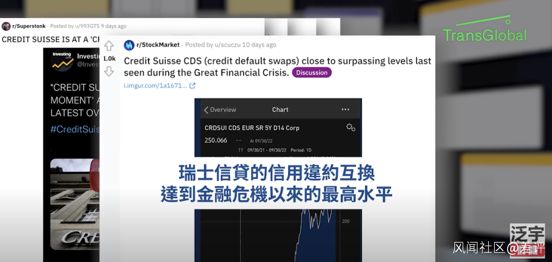 另一邊,用來衡量企業債務違約概率的指標 cds 顯示,瑞信違約的概率有 23%,這已經達到了當年雷曼兄弟倒閉前的水平了。