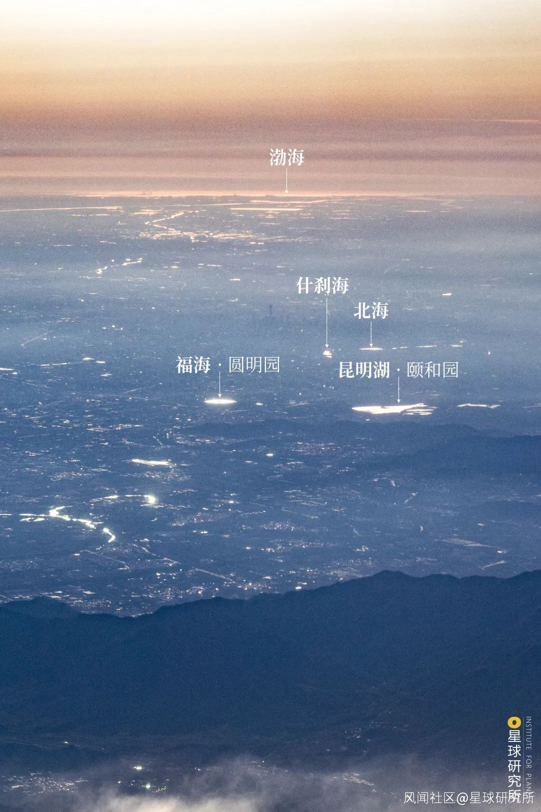 (視線穿越200千米後,誕生仙山傳説的渤海與北京北海、頤和園昆明湖、圓明園福海三個想象中的“海景”同框,攝影師@陳肖)