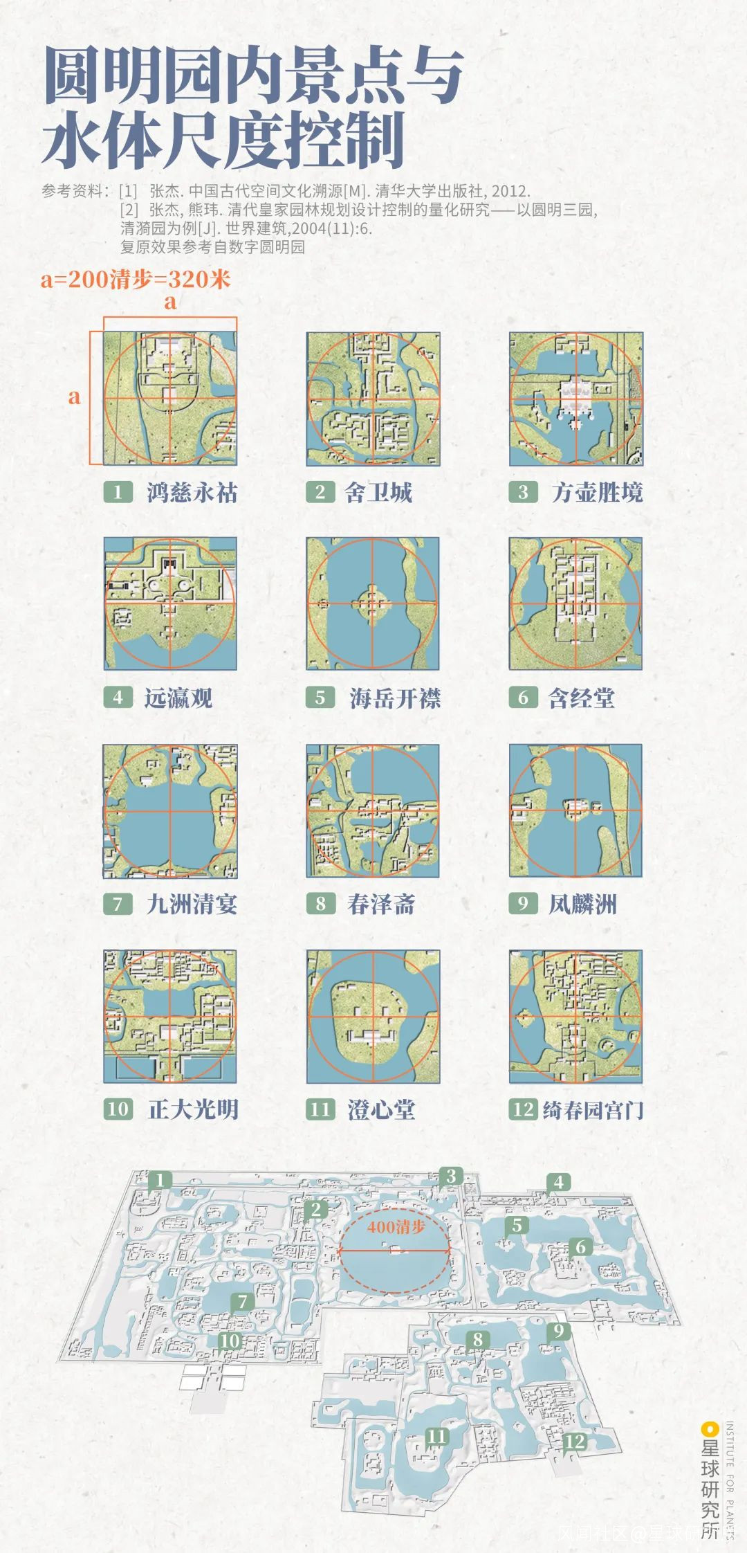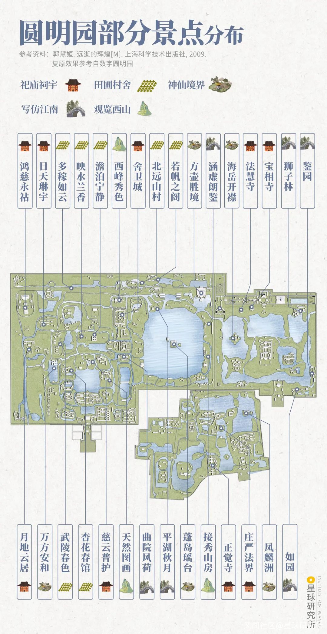 (請橫屏觀看,圓明園部分景點示意,製圖@龍雁翎/星球研究所)