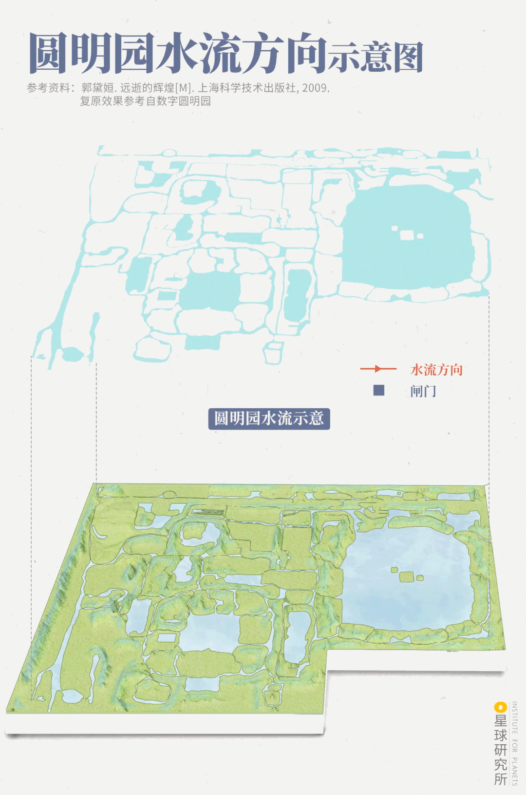 (圓明園水流方向示意,此處圓明園為狹義,製圖@楊寧/星球研究所)