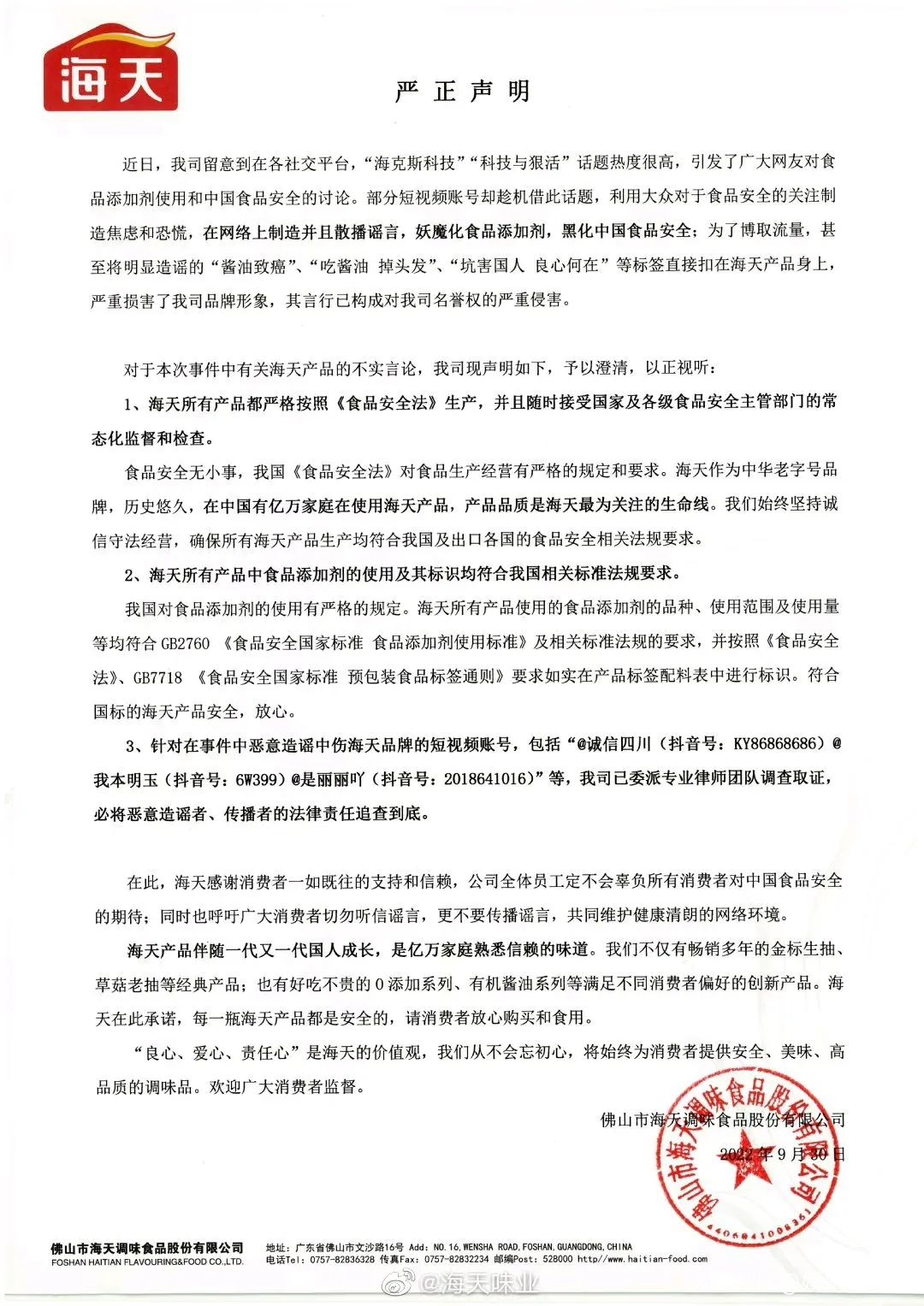 近日引發熱議的**“海天醬油國內外雙標”事件,同樣展示出了傳統企業互聯網思維的缺乏,不擅長互聯網公關的短板**。海天官方先是在9月30日發佈了一則警告意味濃厚的“嚴正聲明”,強調海天合法、添加劑符合標準,對於自媒體賬號將進行法律追責,卻沒有提及公眾關心的食品添加問題、出口雙標問題,因“嘴硬”將自身推向民意的對立面。