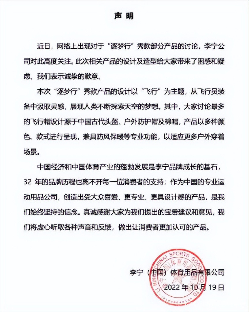 同海天醬油相似的高傲姿態,更致使**高管的朋友圈回應成了一場公關災難。**今日李寧通過官博致歉稱:“此次相關產品的設計及造型給大家帶來了困惑和疑慮,我們表示誠摯的歉意。……其中,大家討論最多的飛行帽設計源於中國古代頭盔、户外防護帽及棉帽。”李寧對外強調,飛行帽目前並未生產和銷售,未來也不會生產和銷售。
