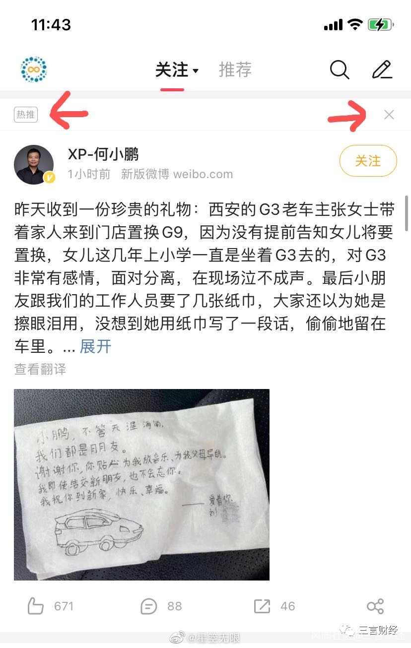 紙條的事情是昨天發生的,何小鵬在今天中午就發了一條長長的微博。有人發現,何小鵬還買了熱推。多種跡象都表明,何小鵬對這件事很上心。