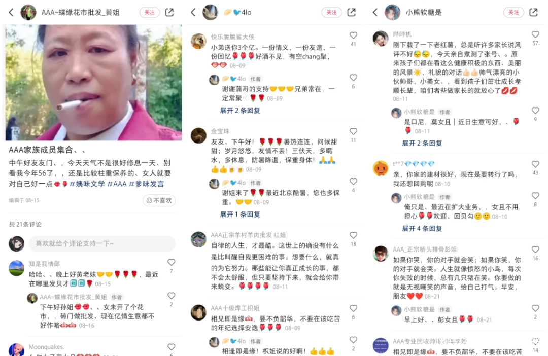 年輕人不僅對衣着輕車熟路,在起網名這條路上也同樣得心應手。遵守着“AAA+職業+暱稱”的起名原則,年輕人先是給自己起個類似“AAA小賣部李姐”、“AAA土雞蛋批發-王哥”的網名,再是模仿中老年人的語言風格,以假亂真攪渾了小紅書裏的“中年文學”。