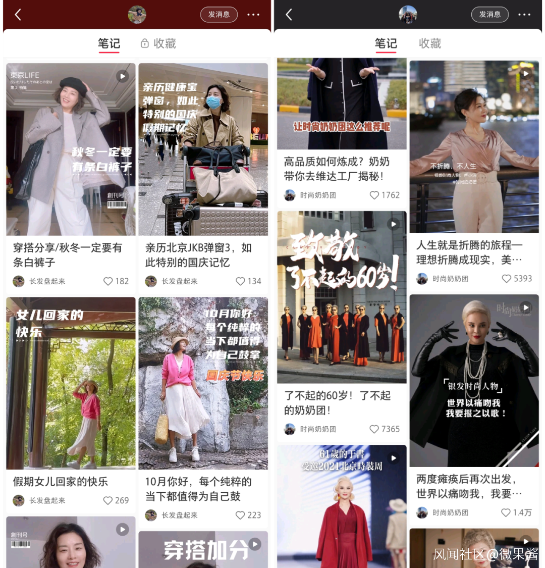 除此之外,諸如“長髮盤起來”、“時尚奶奶團”發佈的穿搭分享,則是呈現出另一種時尚潮流風。如同年輕博主一樣,這一類中老年博主的“種草”路徑是——精緻的全身穿搭、妝容齊全,再配上“活在當下”“不辜負自己”等勵志話語,從物質到精神層面俘獲用户的心。