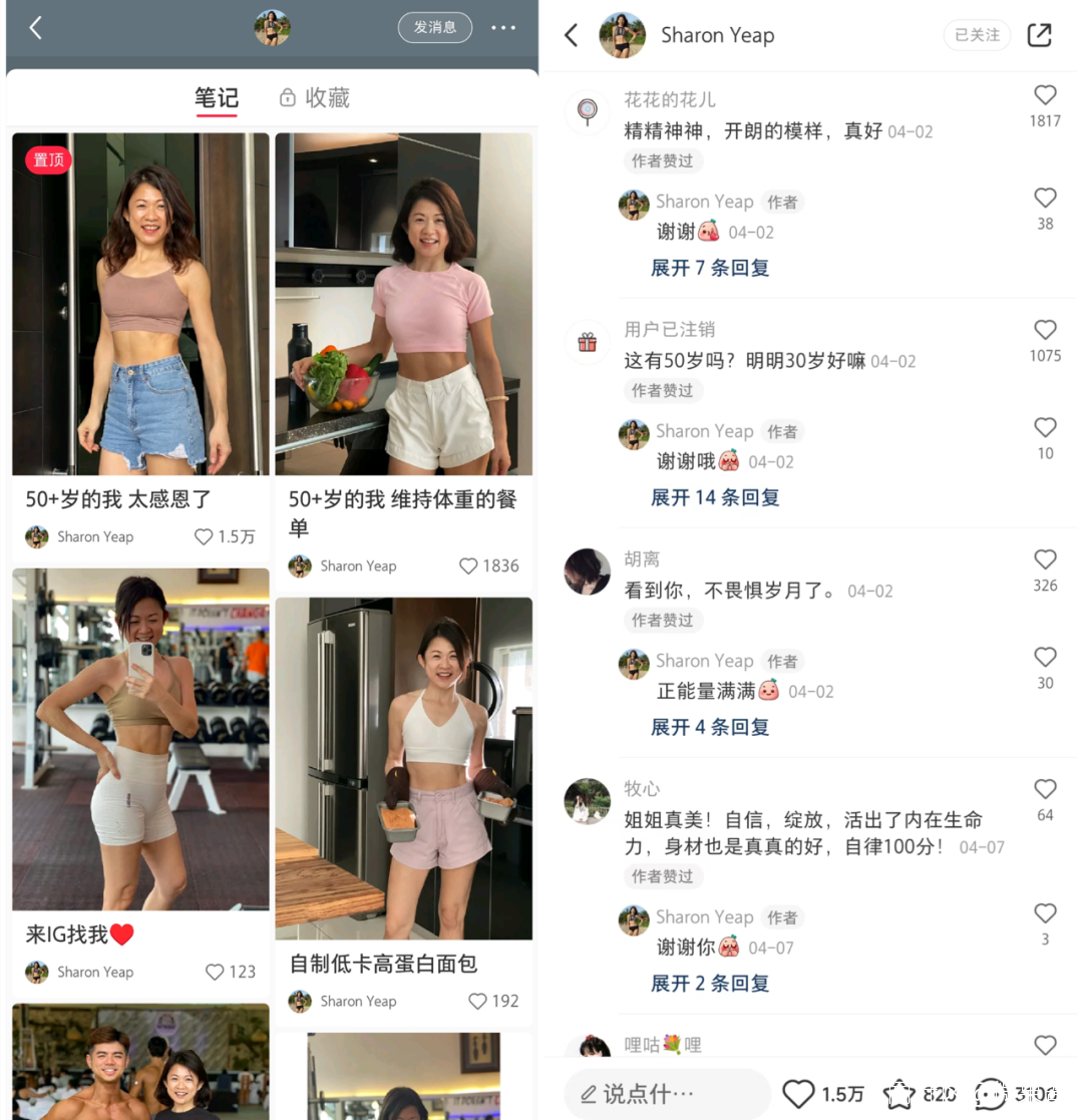 51歲的“Sharon Yeap”同樣是小紅書裏眾多中老年健身博主之一。從一開始僅僅將小紅書當做生活備忘錄,到如今成為健身服飾、保健品等品牌方青睞的博主,“Sharon Yeap”靠着健身日常實現了素人到商業博主的蜕變。