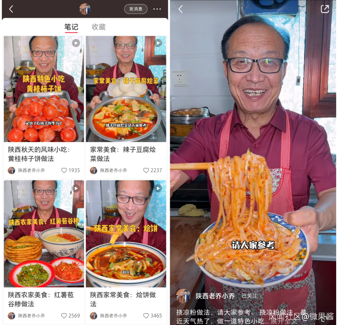 在“陝西老喬小喬”的視頻裏,所有的美食教程都是以家常做法為標準,視頻中的那句“請大家參考”不僅體現了中老年人特有的“謙虛風格”,還讓一眾網友倍感親切,甚至網友坦言:“20幾歲天天就愛看老爺子。”