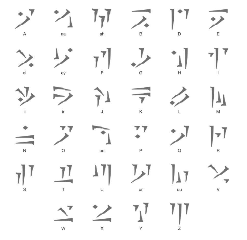 3. 色斯文(Cirth):中土大陸上辛達精靈戴隆(Daeron)為辛達林發明的文字,後為矮人族廣泛使用。