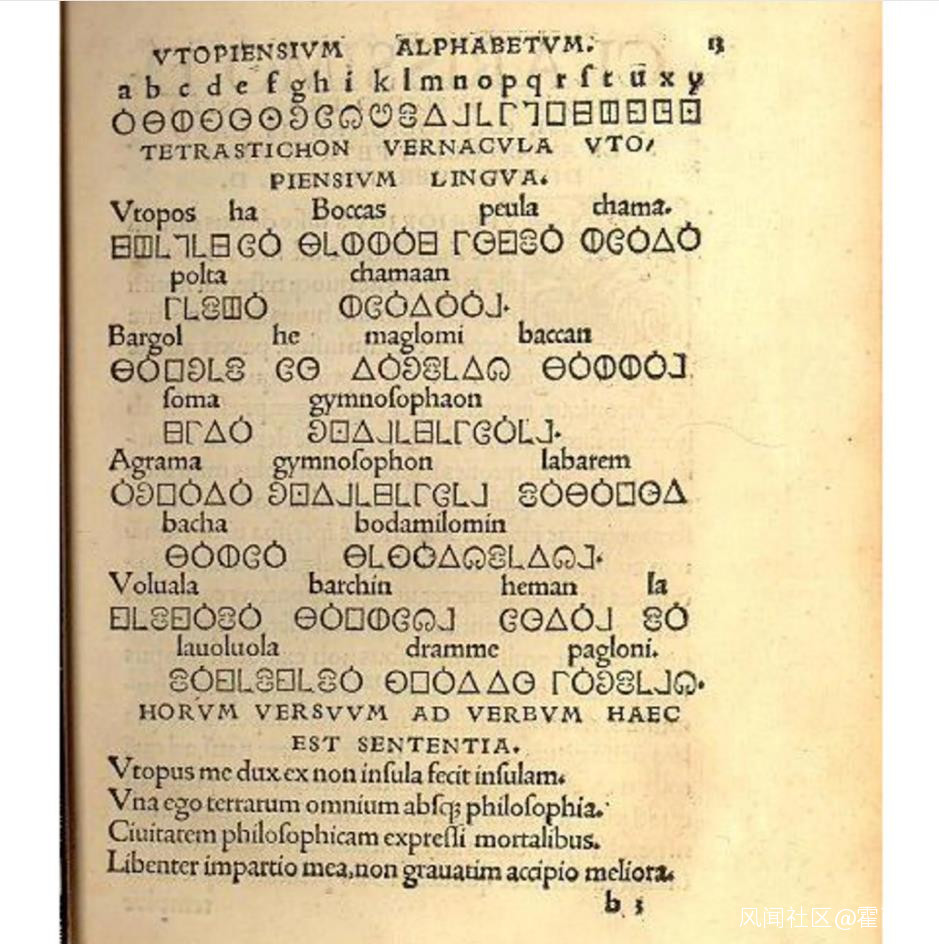 早在《烏托邦》(Utopia,1516)一書中,就出現了一段由虛構的 “烏托邦文” 寫成的四行詩。這種文字由幾何圖形構成,共有 22 個字母,和當時的拉丁字母表一一對應(僅缺少 Z)。作者托馬斯·莫爾(Thomas More)和朋友彼得·吉爾斯(Peter Giles)也構造了烏托邦的語言,但這種語言的僅有樣本便是這首詩了。
