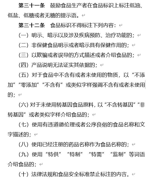 但我們的監管機構卻是清醒的。早在2020年,中國國家市場監管總局就就《食品標識監督管理辦法》,向社會公開徵求意見,其中第三十二條明確寫道,食品標識不得標註“無添加”、“不添加”等字樣,強調不含有或未使用的物質。而第三十一條,則鼓勵食品生產者在食品標識上標註低油、低鹽、低糖或無糖的提示語。