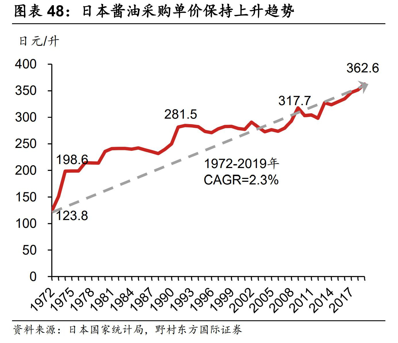 從1972年到2017年,日本醬油的出貨量,從117萬公秉(千升),逐漸下降到了76.8萬;而採購單價,卻從123.8日元每升,上升到了362.8日元。雖然消費量整體是越來越少的,但價格卻翻了三倍,廠商們成功實現了利潤的逆勢上漲。日本醬油企業持續50年,對消費者們進行“教育”,最終成功讓他們接受了“無添加等於健康”的概念。到了今天,日本市場銷售的醬油裏,88.2%是無添加醬油,而有食品添加劑的只佔10%。