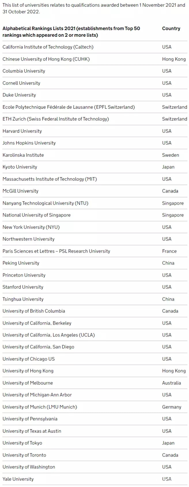 這些院校(除英國以外)必須在3個知名排名(THE世界大學排名、QS世界大學排名和ARWU世界排名)裏,至少有2個位列Top50。