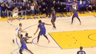 第三節中,克雷給維金斯餵了個扣籃後,維金斯逸興遄飛,回頭蓋了一個威少;勒布朗砸了個扣籃後,維金斯旁觀着不太樂意;暫停之後,勇士防守施壓,戴維斯籃下被圍啃不動,威少翼側拿球,追夢藐視地看他,於是威少一個三不沾。
